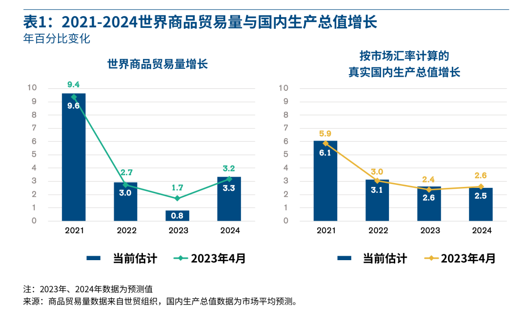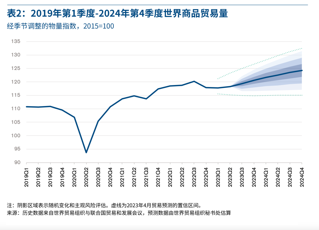 目前世贸组织预测,2023年全球商品贸易增长率仅为0.8%,低于此前预测的1.7%。但世贸组织仍期望2024年有更强劲的贸易增长,并保持3.3%的增长预测不变。