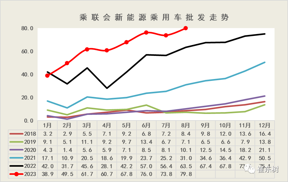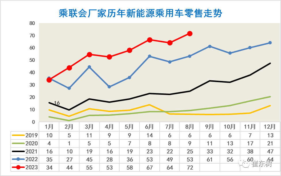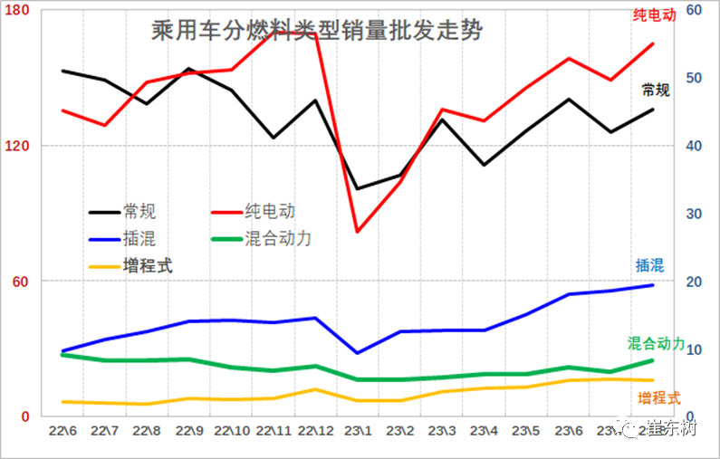 此图是 1:3 的比例,可清晰看到传统车与新能源车形成反差,新能源大幅向上,传统车回升缓慢。纯电动与传统车走势相对分化。插混和混动的走势也是较强的。8 月的燃油车走势较强,高于 3 月销量。8 月的插混新能源持续大幅走强。増程表现也很强。