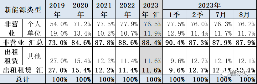 纯电动车的租赁市场目前表现逐步的回暖,2019 年出租租赁占纯电动车销量处于峰值,随后 2020 年出租租赁的占比下降,2021-2022 年表现下降到 10% 左右,但 2023 年 8 月回升到 11%,其中限购城市和大型城市的占比提升迅猛。