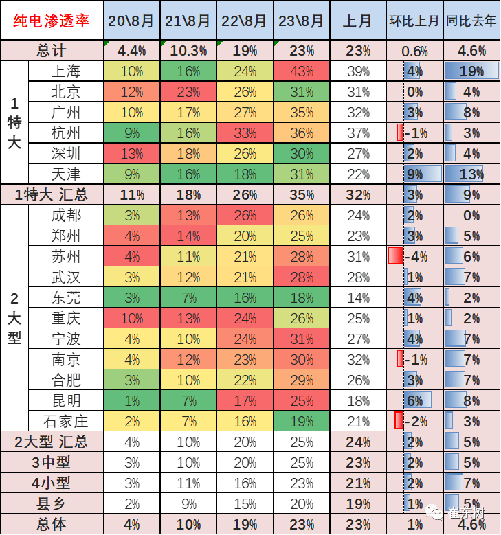 目前看限购城市的纯电动车占比大幅提升,从 2020 年 8 月的 11% 上升到 2023 年的 35%。