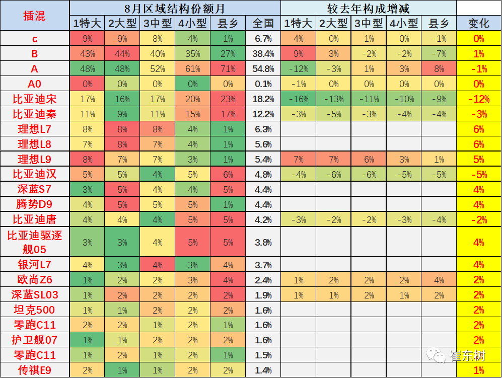 8 月插混走强,大中型非限购城市仍是插混主力,限购城市需求占比下降,县乡市场的插混形成较好的推动。