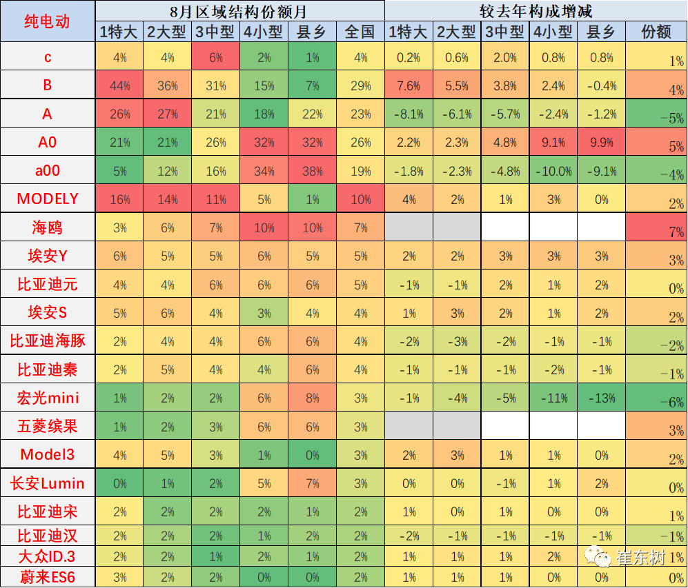 从主力车型的表现来看,也是体现了主力车型在大中城市的表现改善,尤其是 8 月以比亚迪为代表的增量,相比较同期的份额增量是中型市场增长 1-2 个百分点。从特斯拉来看, 8 月份较同期的的主力区域更延伸到中小城市市场,特大型城市的纯电动市场增长相对较好。