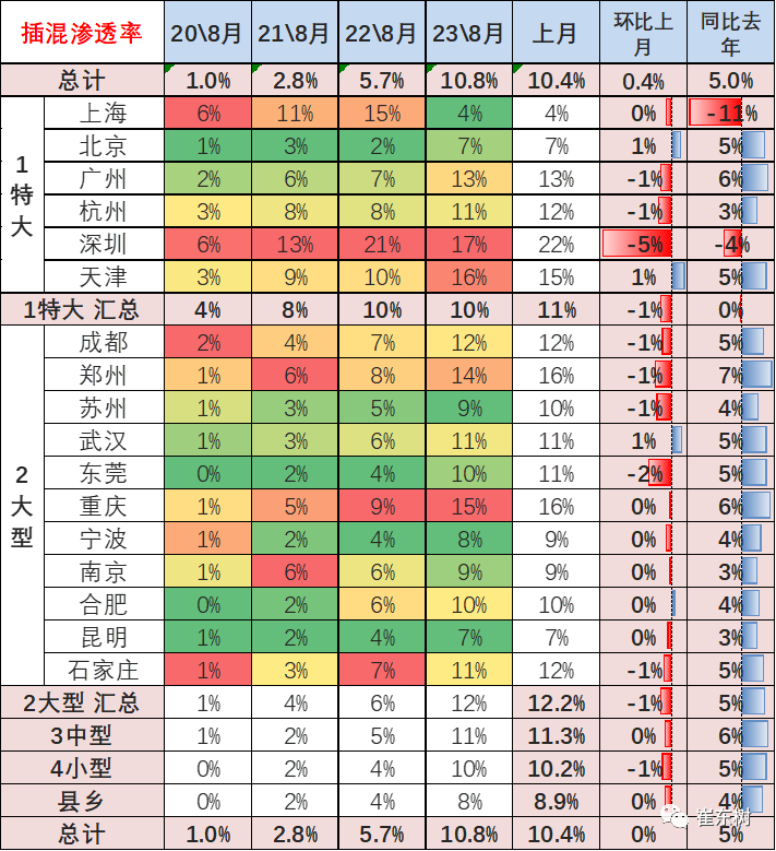 插混在全国各地市场渗透率都持续增长,尤其在特大型城市,今年 8 月插混车市场占比达到 11%;在中小城市市场的插混市场的占比也呈现持续提升的特征,各类城市间的插混渗透率差距相对缩小。