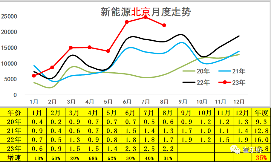 北京市场 2022 年新能源车市场走势相对较平稳,2023 年 8 月销量达到 2.2 万台,大幅高于去年同期,牌照指标充分消化。2023 年的累计销量同比增长 35% 的表现较好。