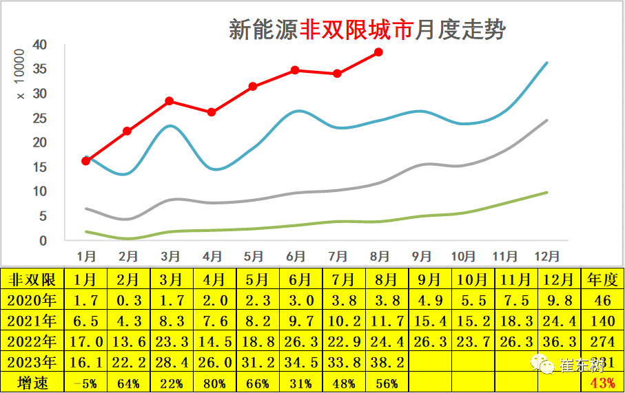 2022 年非双限城市累计达到 274 万台水平,同比增长 96%,呈现了强势增长特征。2023 年新能源车在非双限城市的表现极其优秀,8 月份销售 38.2 万台的增速 56%。
