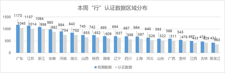 2023年9月第四周,上报 “行”认证统计数据中基于国家标准检测车辆为14132台,提报数较上周增加约5%,其中,符合“行”认证标准的12411台占比约为87%,符合团标的7995占比约57%,整体车况质量与上周基本持平。