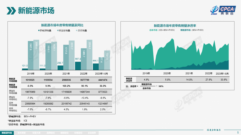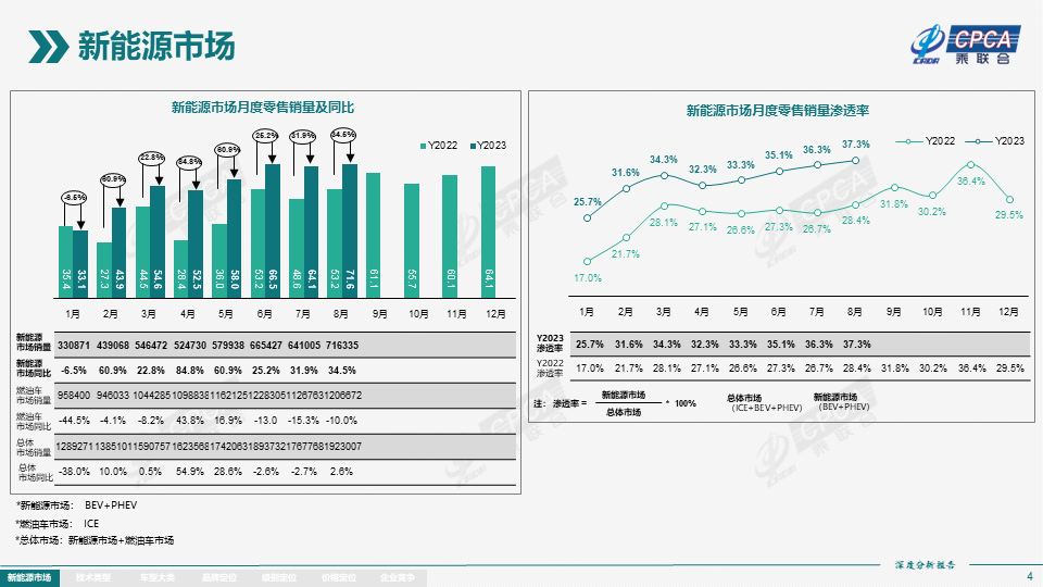 - 新能源市场月度及年度零售销量、同比、渗透率