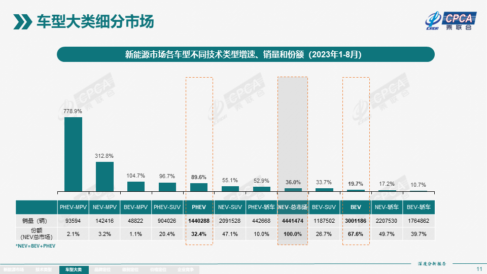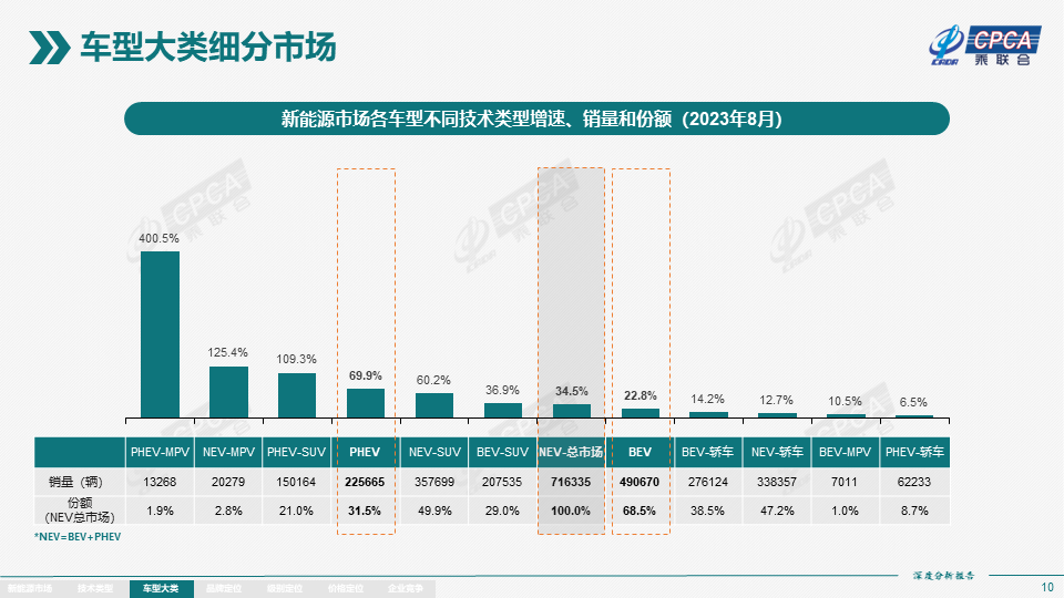 - 新能源市场各车型不同技术类型增速、销量及份额(2023年8月及累计)
