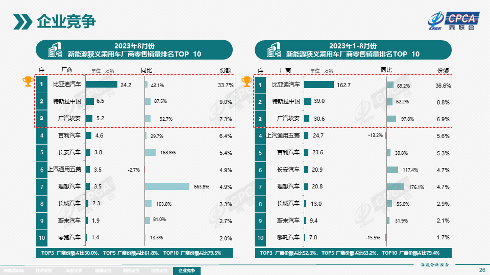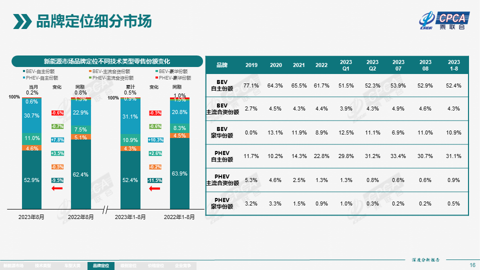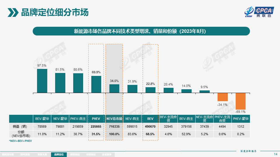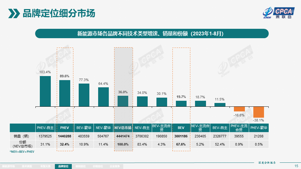 - 新能源市场各品牌不同技术类型增速、销量及份额(2023年8月及累计)