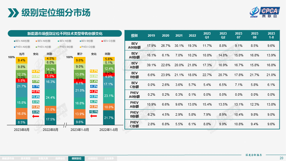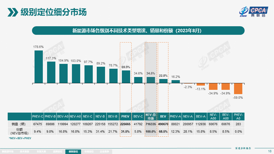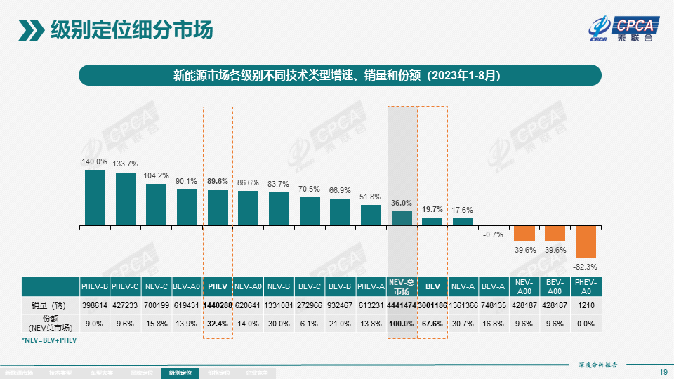 - 新能源市场各级别不同技术类型增速、销量及份额(2023年8月及累计)