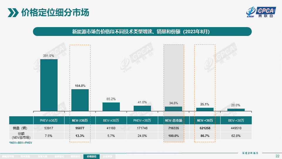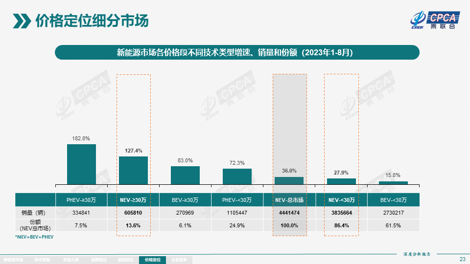 - 新能源市场各价格段不同技术类型增速、销量及份额(2023年8月及累计)