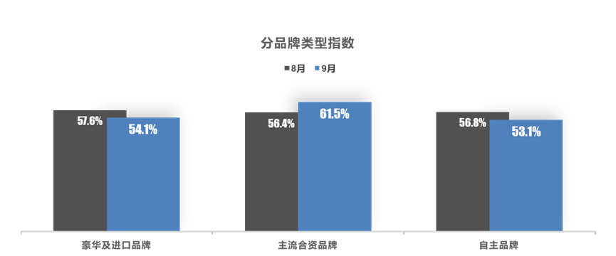 从分品牌类型指数看:9月进口及豪华、 自主品牌指数环比下降、合资品牌指数环比上升。