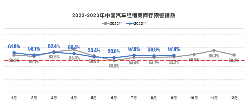 2023年9月28日,中国汽车流通协会发布的最新一期“中国汽车经销商库存预警指数调查”VIA(Vehicle Inventory Alert Index)显示,2023年9月中国汽车经销商库存预警指数为57.8%,同比上升2.6个百分点,环比上升0.9个百分点,库存预警指数位于荣枯线之上,汽车流通行业处在不景气区间。