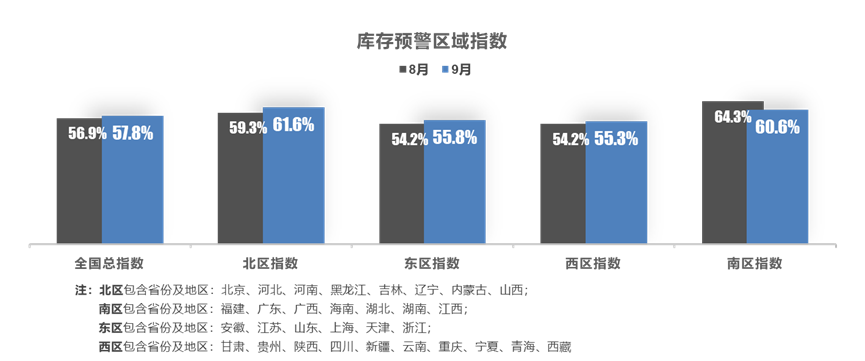 从区域指数情况看:9月全国总指数为57.8%,北区指数为61.6%,东区指数为55.8%,西区指数为55.3%,南区指数为60.6%。