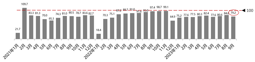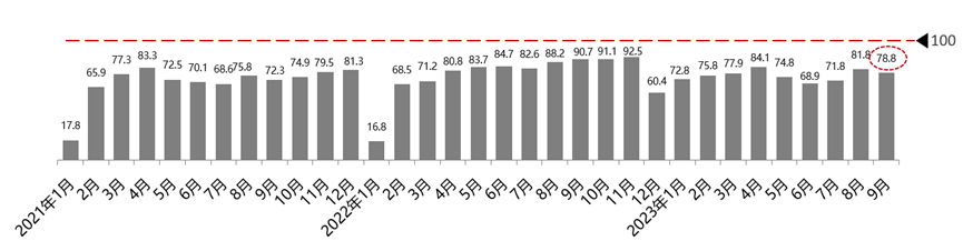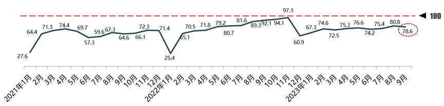 2023年10月9日,中国汽车流通协会发布最新一期“汽车消费指数”:2023年9月份汽车消费指数为78.6,略低于上月。