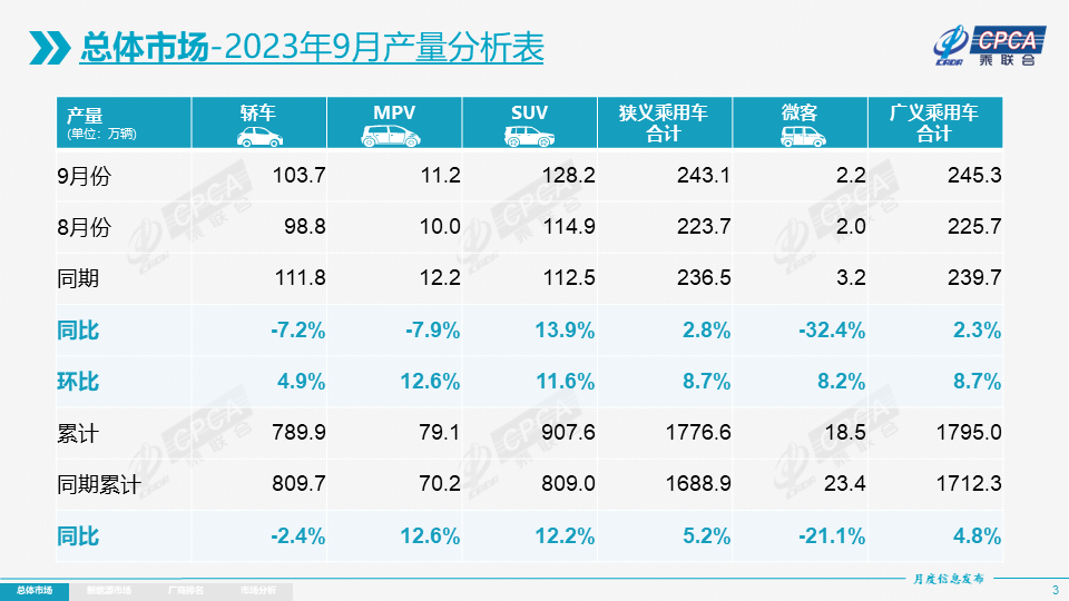 生产:9月乘用车生产243.1万辆,同比增长2.8%,环比增长8.7%。由于市场竞争已发生结构性变化,企业生产极其谨慎。其中豪华品牌生产同比下降17%,环比下降11%;合资品牌生产同比下降10%,环比增长19%;自主品牌生产同比增长17%,环比增长8%。