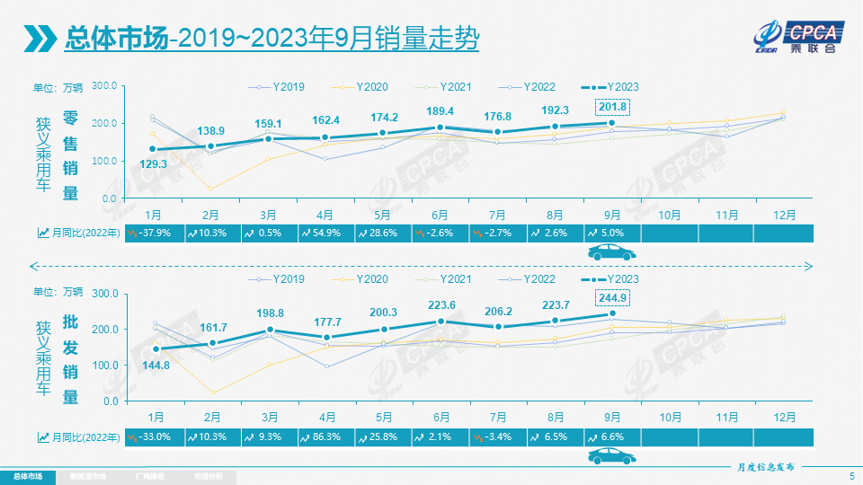 零售:2023年9月乘用车市场零售达到201.8万辆,同比增长5.0%,环比增长5.0%。今年以来累计零售1523.3万辆,同比增长2.4%。