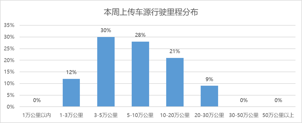 从上传车源行驶里程数据来看,本周上传数据中,1-3万公里的“准新车”数据较上周增加了1%,3-5万公里以内的“较新车”数据较上周增加了2%,5-10万公里的“性价比”车源数据减少了1%,10万公里以上的车源数据均较上周下降了1%。