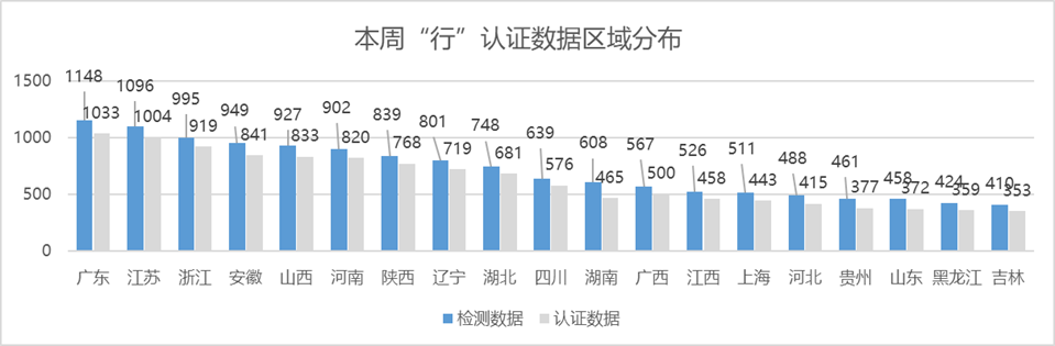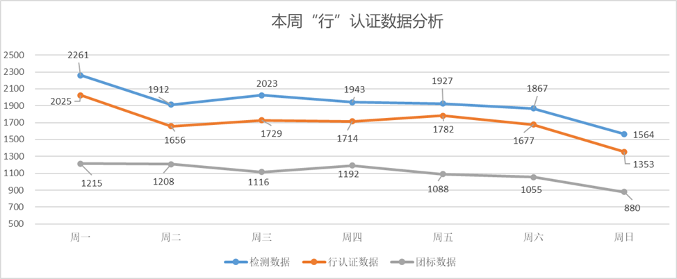 10月份第四周,上报 “行”认证统计数据中基于国家标准检测车辆为13497台,较上周降低了约2%,其中符合“行”认证标准的11936台,占比约为88%,符合团标的7754台占比约57%,整体车况质量与上周有所提升。