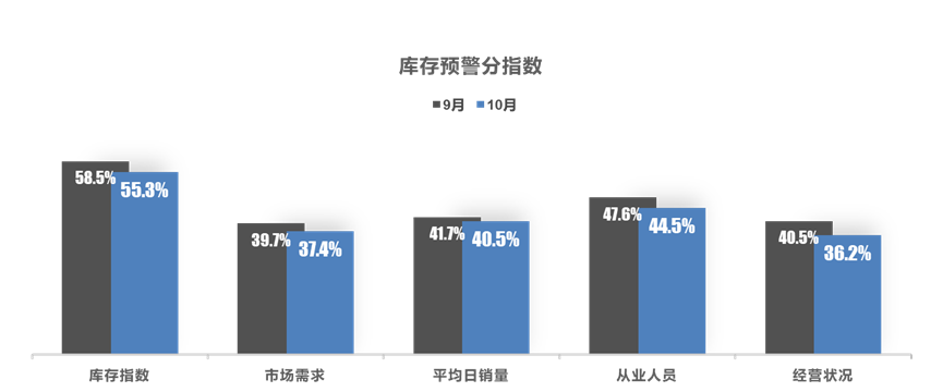从分指数情况看:10月库存、市场需求、平均日销量、从业人员、经营状况指数环比下降。
