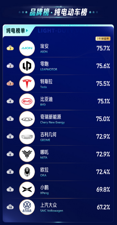 在纯电品牌当中,广汽埃安则以75.7%的保值率,拿下了纯电品牌的第一名。