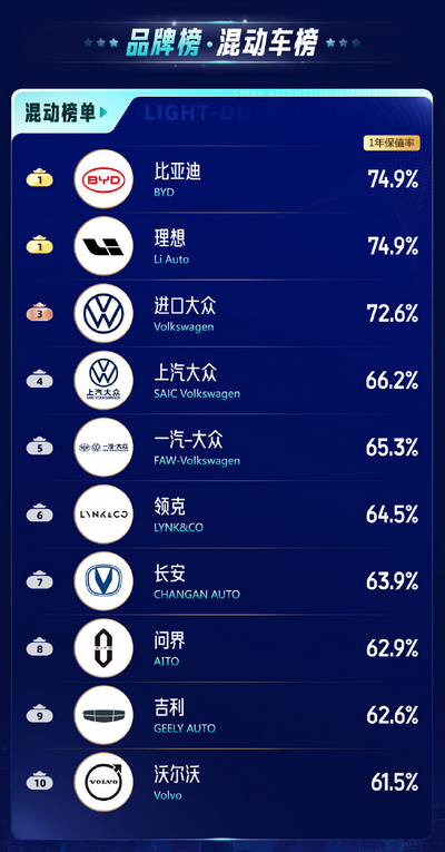 报告显示,在混动品牌当中,比亚迪与理想以74.9%的保值率,并列第一。