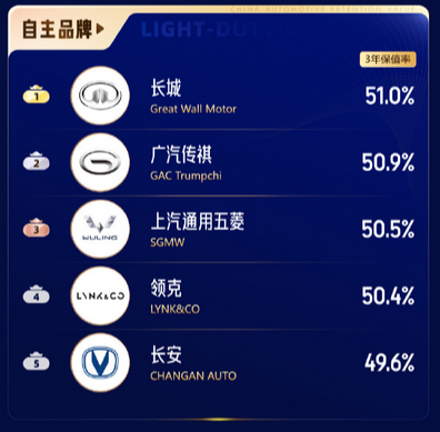 在国产燃油车领域,长城以51%的保值率拿下了自主品牌的第一。