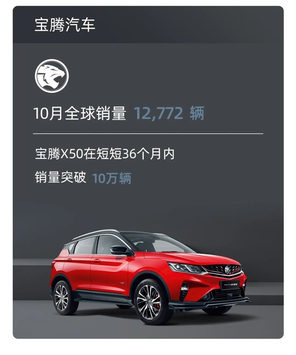 宝腾汽车10月全球销量12772辆,宝腾X50在3年内销量突破10万辆。