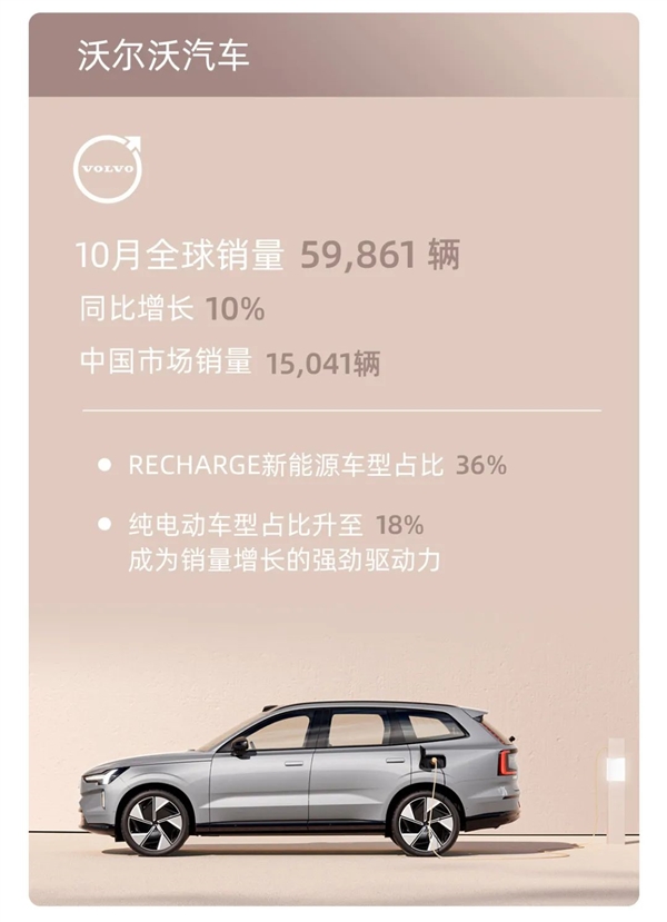 沃尔沃汽车10月全球销量59861辆,同比增长10%,其中RECHARGE新能源车型占比36%,纯电动车型占比升至18%,在中国市场,沃尔沃共卖出15041辆。