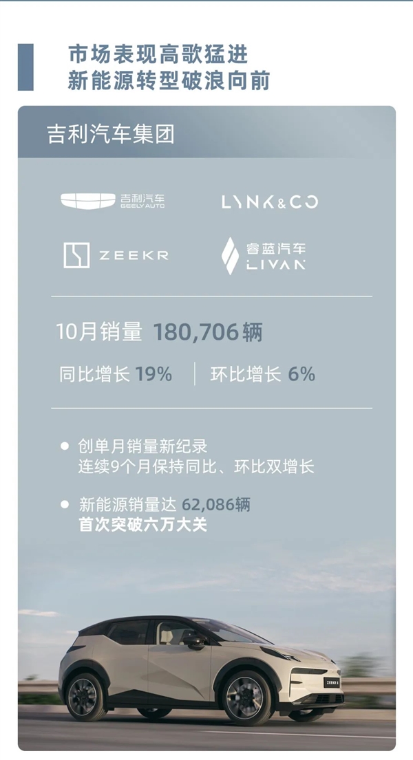 吉利汽车集团(汉吉利汽车、领克汽车、极氪汽车、睿蓝汽车)10月销量180706 辆,同比增长19%,环比增长6%,创单月销量新纪录,连续9个月保持同比、环比双增长,新能源销量达62086辆。