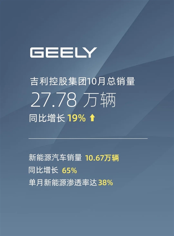 近日消息,吉利控股集团发布了上个月销量数据,总销量27.78万辆,同比增长19%,其中新能源汽车销量10.67万辆,同比增长65%,单月新能源渗透率达38%。
