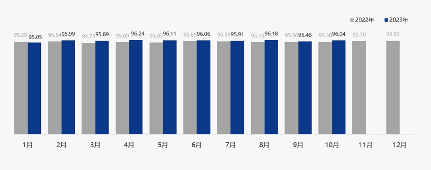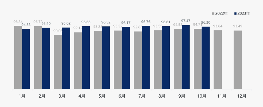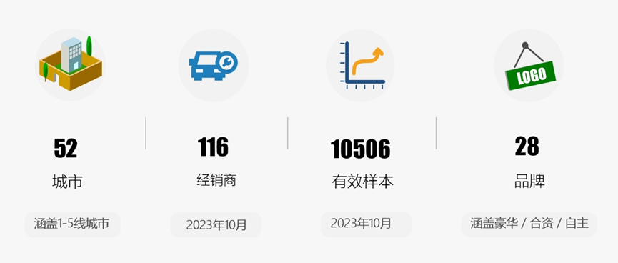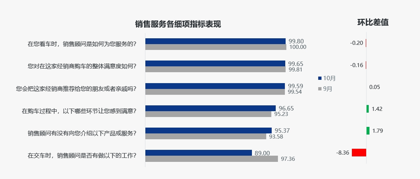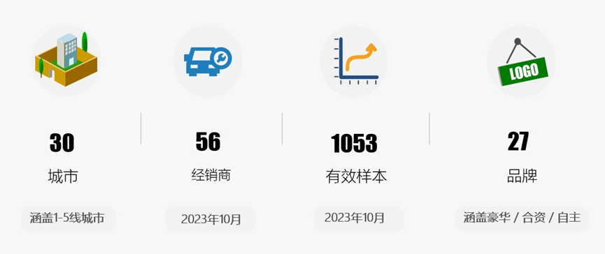 《报告》显示,2023年10月,汽车销售服务口碑指数为96.30分,环比下降1.17分,同比提升1.59分。本月数据覆盖了30个1~5线城市,56家经销商,27个品牌的1053个有效样本量。