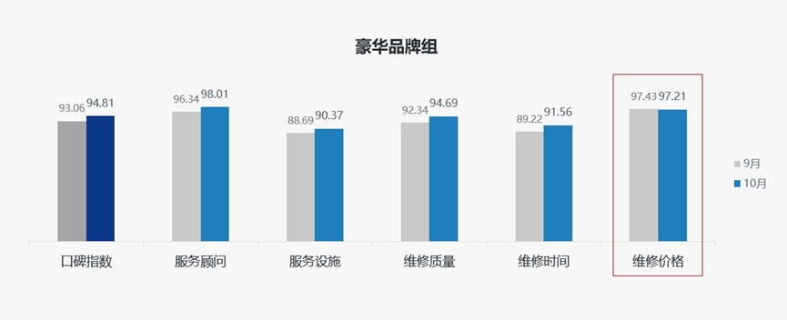 豪华品牌组:豪华品牌组售后服务口碑指数为94.81分,环比提升1.75分;在售后服务五维度中,仅维修价格维度环比下降0.22分,其他维度均环比上升。