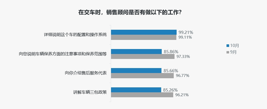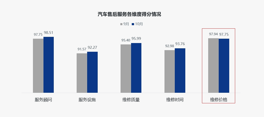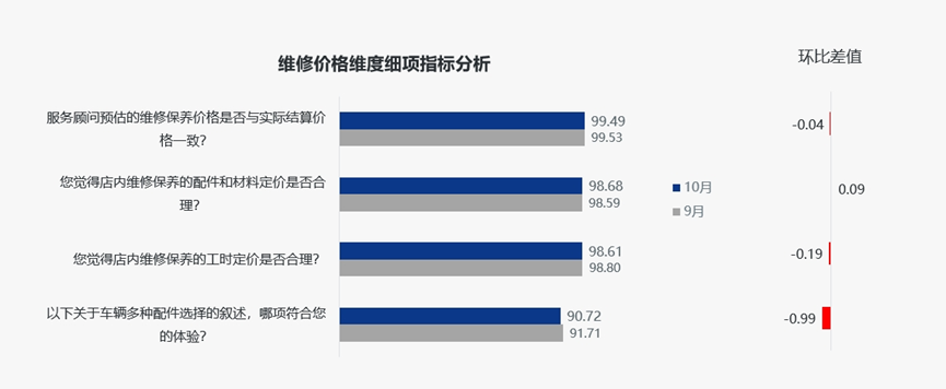 通过维修价格维度各细项指标发现,仅有“您觉得店内维修保养的配件和材料定价是否合理?”环比提升0.09分,其他指标环比下降。“以下关于车辆多种配件选择的叙述,哪项符合您的体验?”下降0.99分。