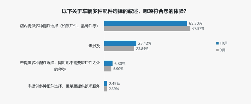 进一步分析“以下关于车辆多种配件选择的叙述,哪项符合您的体验?(单选)”指标,需要关注的是:虽然“店内提供多种配件选择(如原厂件、品牌件等)”选择占比降低2.57%,但其中选择“未提供多种配件选择,同时也不需要原厂件之外的种类”比例提升0.9%,选择“未提供多种配件选择,但希望提供该项服务”的比例提升0.1%。