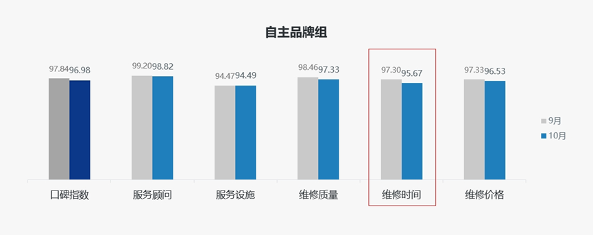 自主品牌组:自主品牌组售后服务口碑指数为96.98分,环比下降0.86分;本月售后服务五维度得分中,仅服务设施维度环比微升0.02分,其他维度均是环比下降,其中维修时间维度下降1.63分。