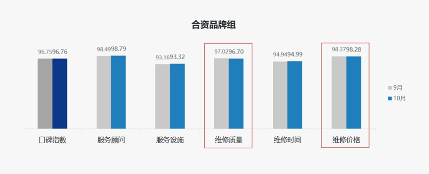 合资品牌组:合资品牌组售后服务口碑指数为96.76分,环比微升0.01分;在售后服务五维度中,维修质量维度环比下降0.32分,维修价格维度环比下降0.09分。