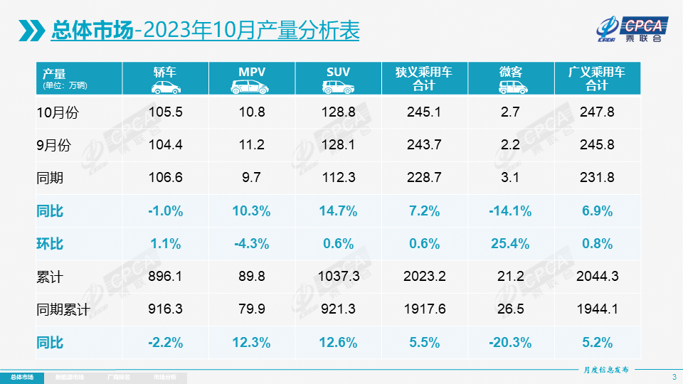 生产:10月乘用车生产245.1万辆,同比增长7.2%,环比增长0.6%。由于市场竞争已发生结构性变化,企业生产极其谨慎。其中豪华品牌生产同比下降15%,环比下降7%;合资品牌生产同比下降13%,环比下降8%;自主品牌生产同比增长26%,环比增长6%。