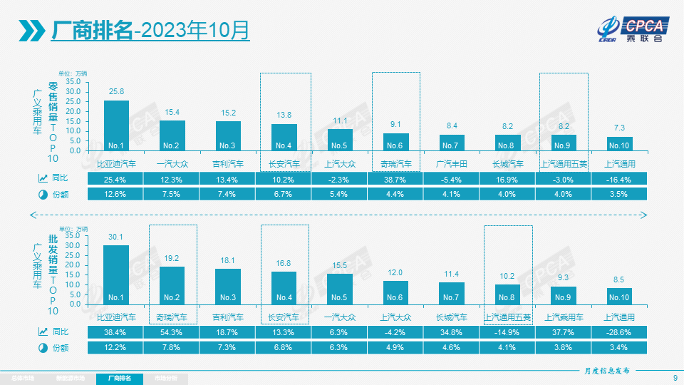 4)车企:10月新能源乘用车企业总体走势较强,比亚迪纯电动与插混双轮驱动夯实自主品牌新能源领先地位;以长安、上汽、广汽、吉利等为代表的传统车企在新能源板块表现尤为顽强。在产品投放方面,随着自主车企在新能源路线上的多线并举,市场基盘持续扩大,厂商批发销量突破万辆的企业达到17家(环比持平,同比增2家),占新能源乘用车总量88.8%(上月88.1%,去年同期85.7%)。其中:比亚迪301,095辆、特斯拉中国72,115辆、吉利汽车62,086辆、长安汽车53,990辆、上汽通用五菱44,626辆、广汽埃安41,503辆、理想汽车40,422辆、长城汽车30,461辆、小鹏汽车20,612辆、上汽乘用车20,472辆、零跑汽车18,202辆、蔚来汽车16,074辆、上汽大众15,603辆、赛力斯14,645辆、哪吒汽车12,085辆、奇瑞汽车11,307辆、上汽通用10,003辆。