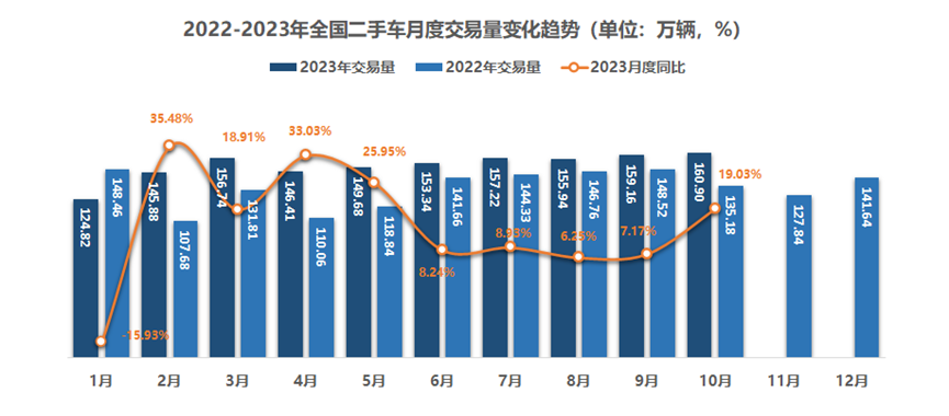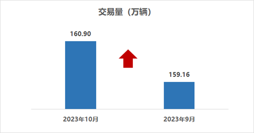 2023年10月,全国二手车交易量160.90万辆,环比增长1.09%,月度同比增长19.03%,交易金额为1039.61亿元。