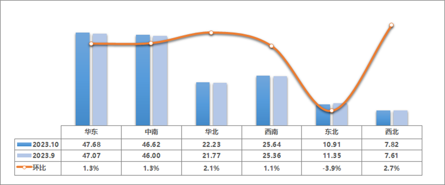 2023年10月,全国六大区中仅东北地区环比上月有所下降,其他各区域均有不同程度的增长。