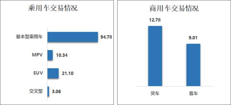 乘用车情况:基本型乘用车共交易94.78万辆,环比增长0.67%,同比增长17.36%;SUV 共交易21.10万辆,环比增长2.01%,同比增长23.98%;MPV共交易10.34万辆,环比增长4.08%,同比增长26.39%;交叉型乘用车共交易3.06万辆,环比下降0.87%,同比增长10.50%。