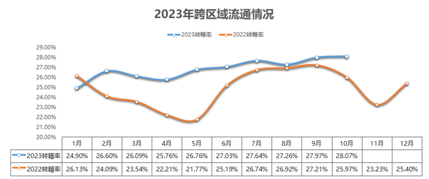 10月份,二手车转籍率为28.07%,环比上月小幅增长了0.1个百分点,同比去年同期增长2.1个百分点。二手车转籍总量为45.18万辆,环比增长了1.5%,较去年同期增长了28.7%。