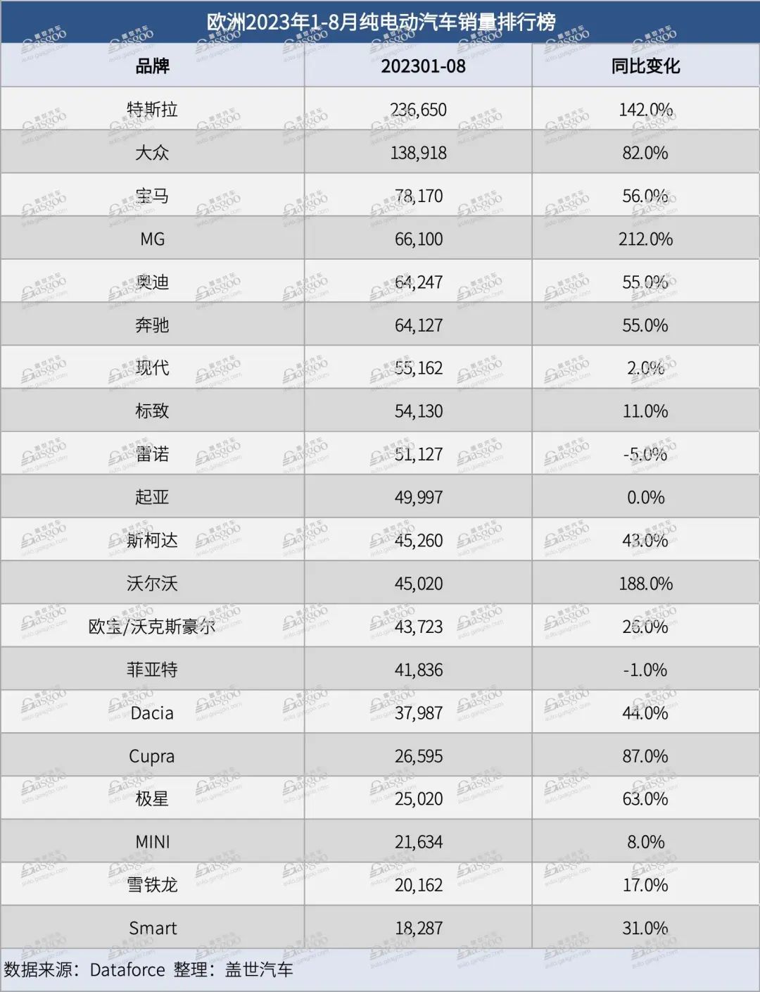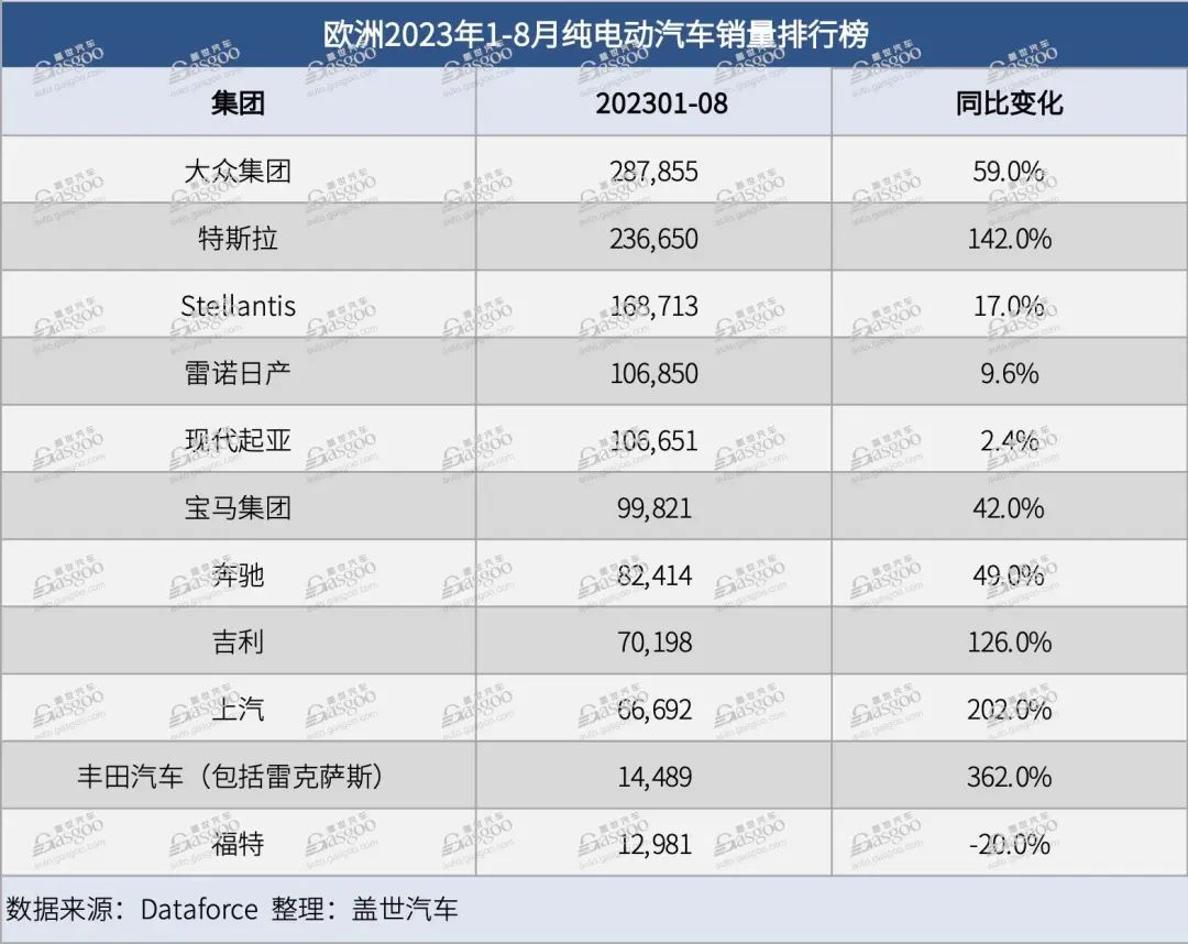 排在第八名和第九名的是中国车企吉利和上汽集团,而且两家车企前八个月在欧洲的电动汽车销量均实现了200%以上的涨幅。其中,吉利的销量包括沃尔沃、极星和路特斯,上汽集团的销量包括MG和大通。