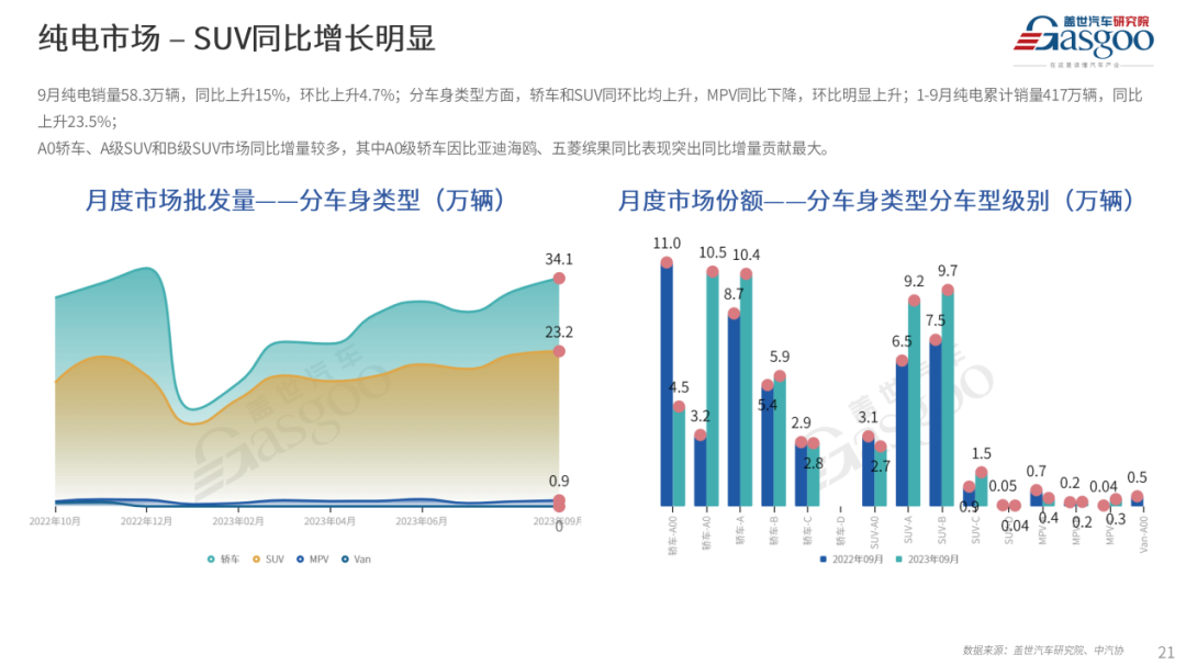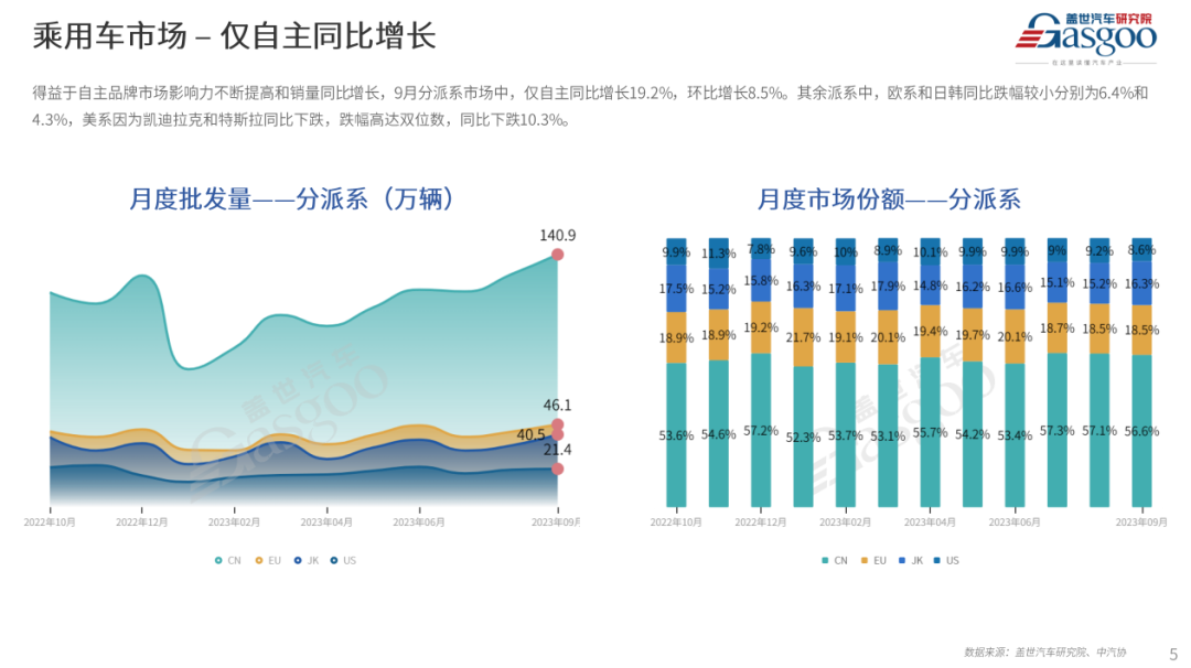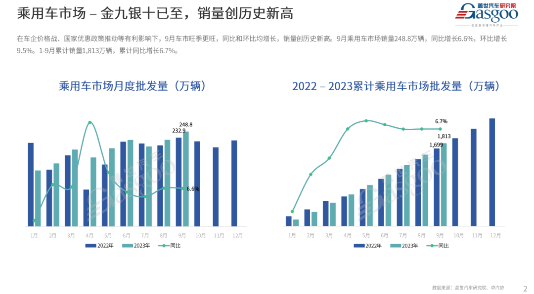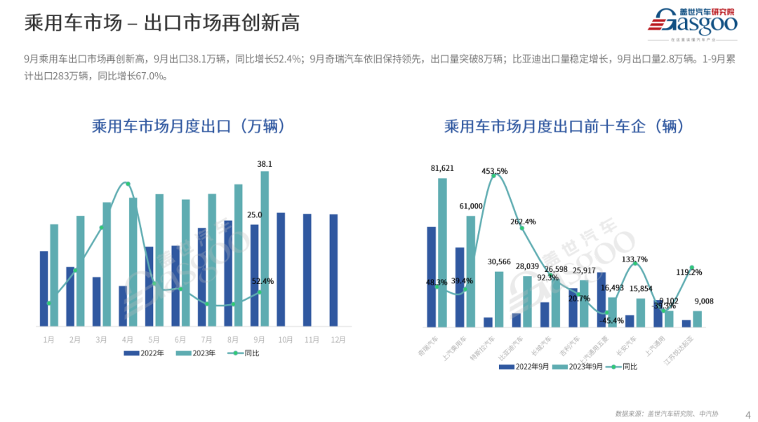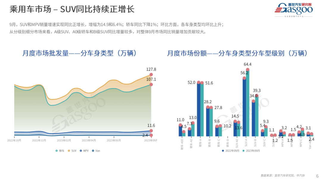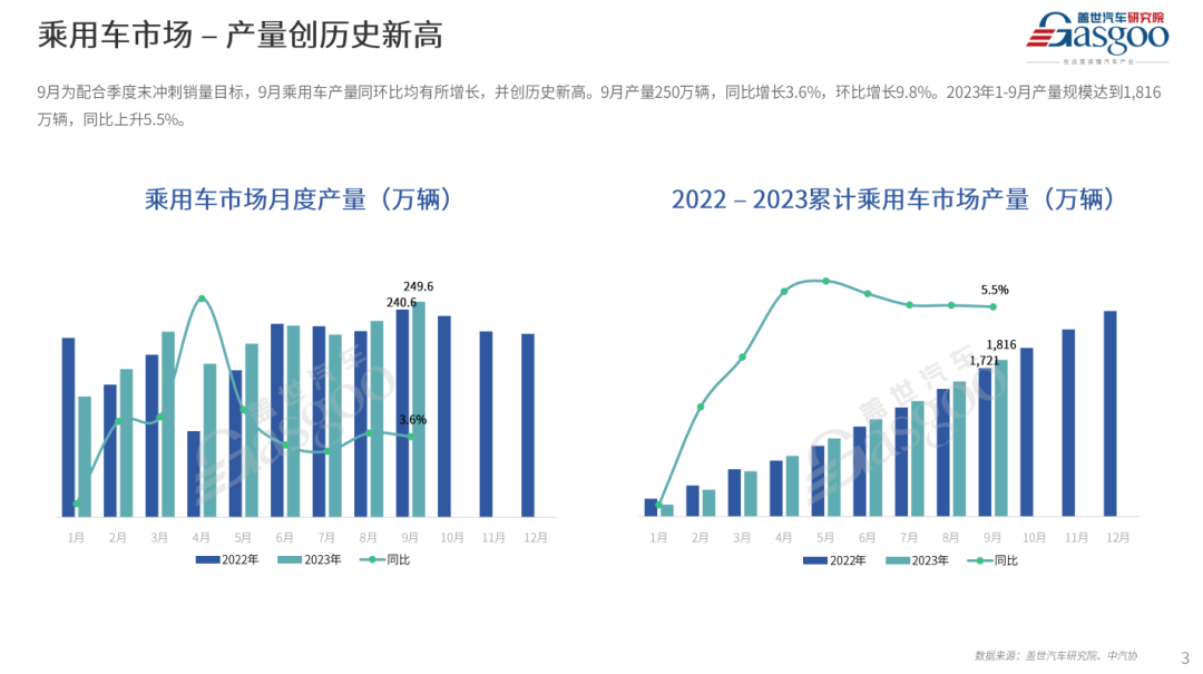 综合以上因素,盖世汽车研究院预测,2023年10月乘用车市场产销量分别将会实现234.7万和233.9万辆,同比预计分别上升0.6%和4.8%,环比均下降6.0%左右。