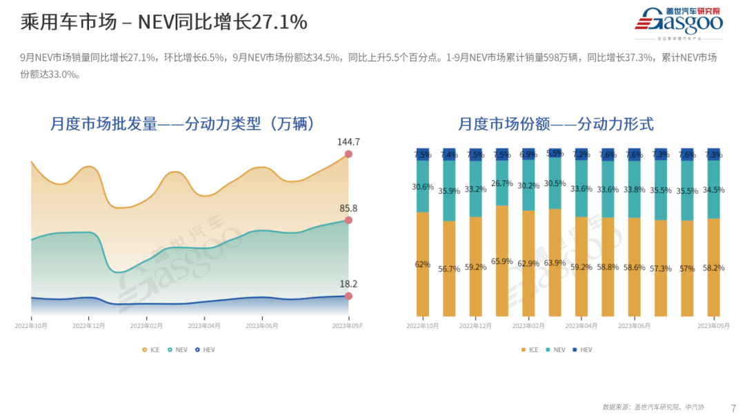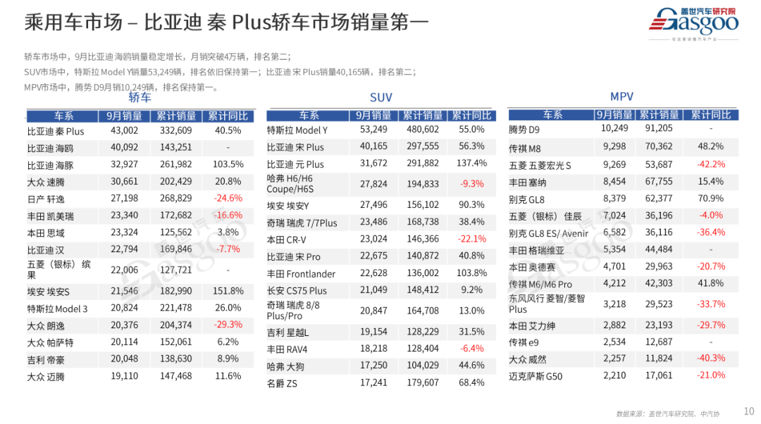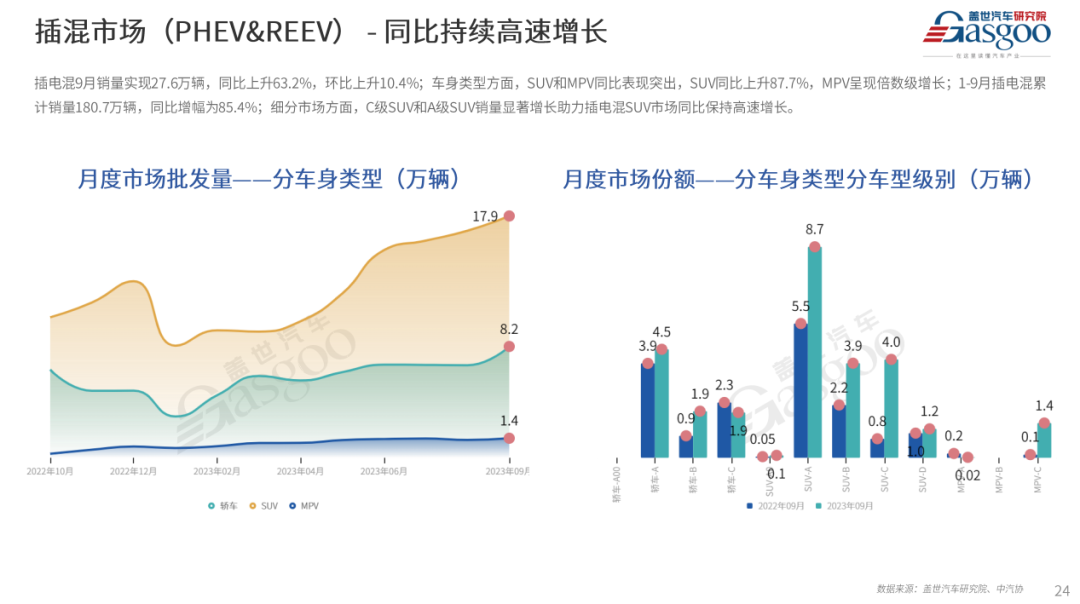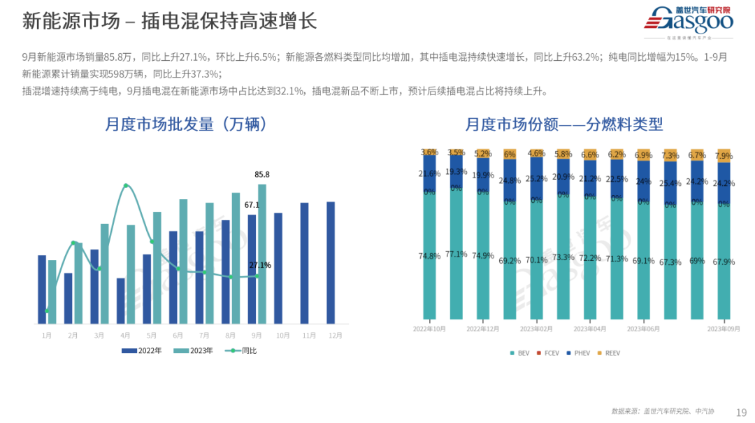 燃油车市场9月销量144.7万辆,环比上升11.8%,同比下降2.4%。价格战主旋律下,燃油车终端优惠力度较大,对消费者具有较强的吸引力,且出口销量持续上升(燃油车在出口销量中占比在7成左右),燃油车整体销量表现超过预期。1-9月累计销量1085万辆,市场份额59.8%,同比下降7个百分点。混动车9月销量18.2万辆,同环比均上升,增幅分别是4.9%和5.7%;1-9月混动累计销量130万辆,市场份额下降0.3个百分点。