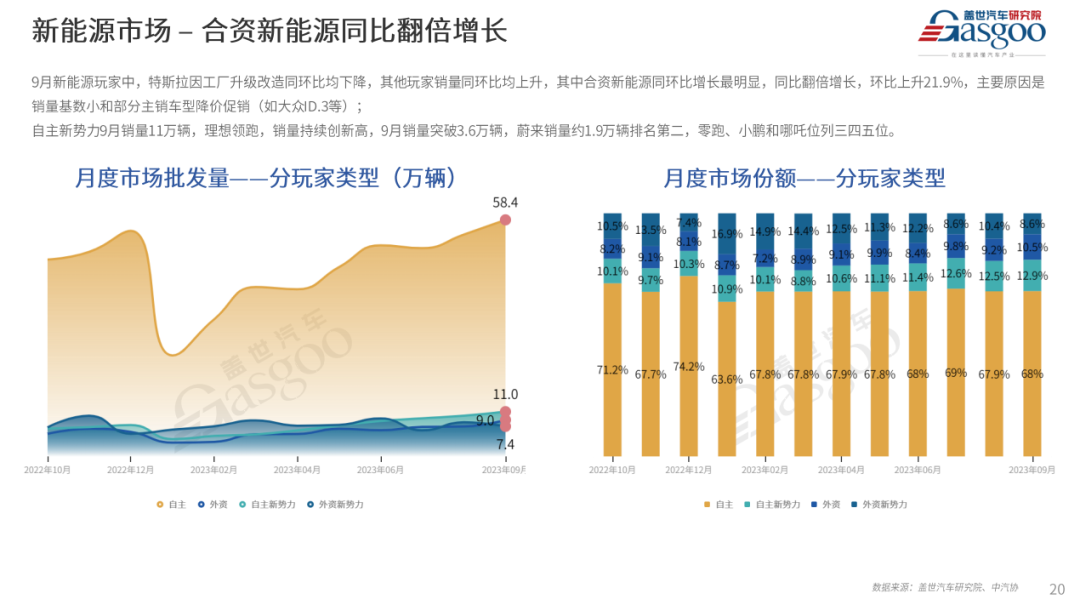 自主新势力方面,9月销量实现11万辆,同比增幅为41.4%;市场份额达到12.5%,同比上升1.3个百分点。车企方面,5家车企月销超过万辆,分别为理想汽车突破3.6万辆、零跑汽车1.58万辆、蔚来汽车1.56万辆、小鹏汽车1.53万辆、哪吒汽车1.3万辆。