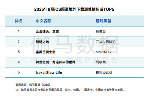 8月出海iOS下载榜中,腾讯新游《合金弹头:觉醒》登顶,并且榜单前三名皆为射击类游戏。而在当月新游下载榜TOP5中有2款角色扮演类产品,分别为开放世界RPG类产品《黎明之地》、MMORPG产品《圣罗兰骑士团》。