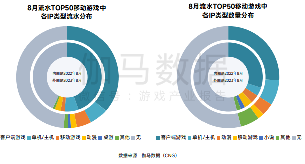 从IP类型流水来看,客户端游戏IP改编产品流水、数量份额均减少,无IP产品流水表现较佳。流水TOP50移动游戏中客户端游戏IP改编产品《和平精英》《梦幻西游》同比流水下滑明显,同时客户端游戏IP改编产品数量同比减少2款。