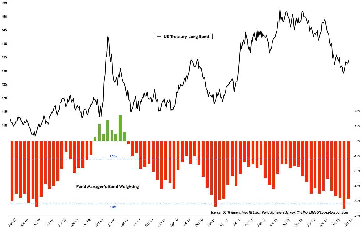 债券和大宗商品、新兴市场股市的处境类似,均处于被看空状态。当前的净低配比例为58%,仅较上月的68%小幅改善。